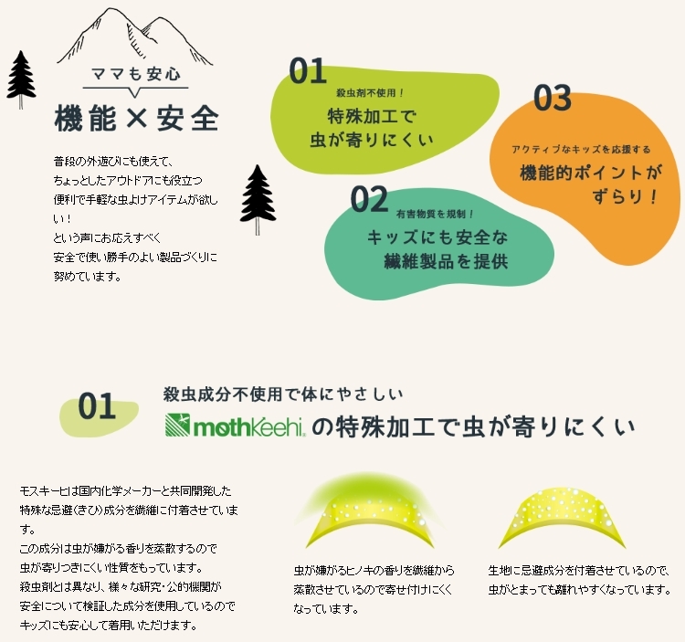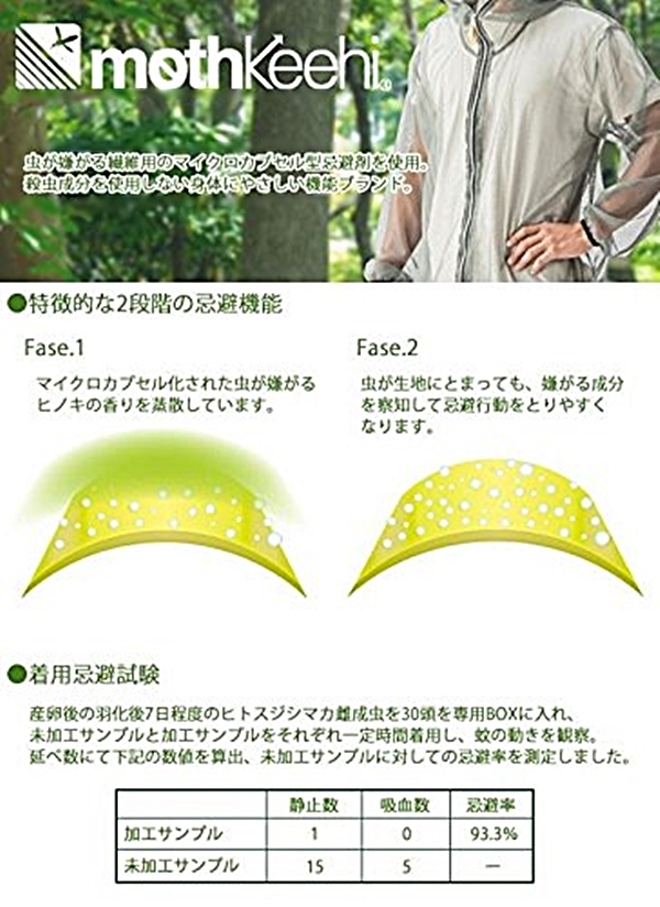 mothKeehi採用微囊技術布料,穿著會自然散發出蚊蟲不喜愛的柏樹香味。