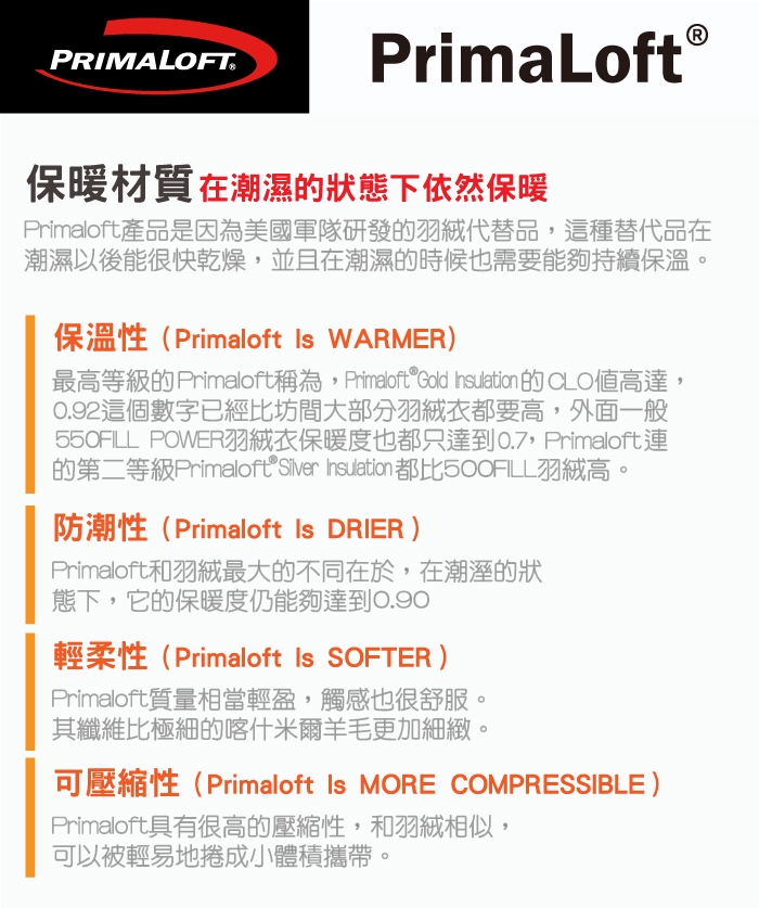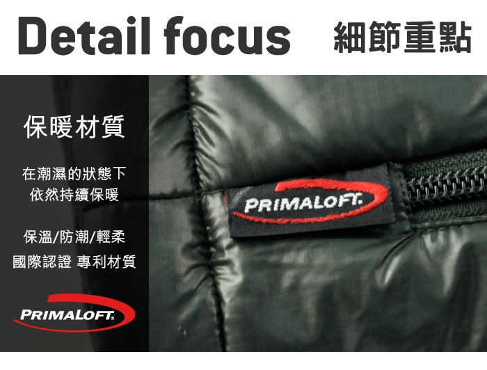 填充物 : PrimaLoft 0ne系列 超輕保暖佳