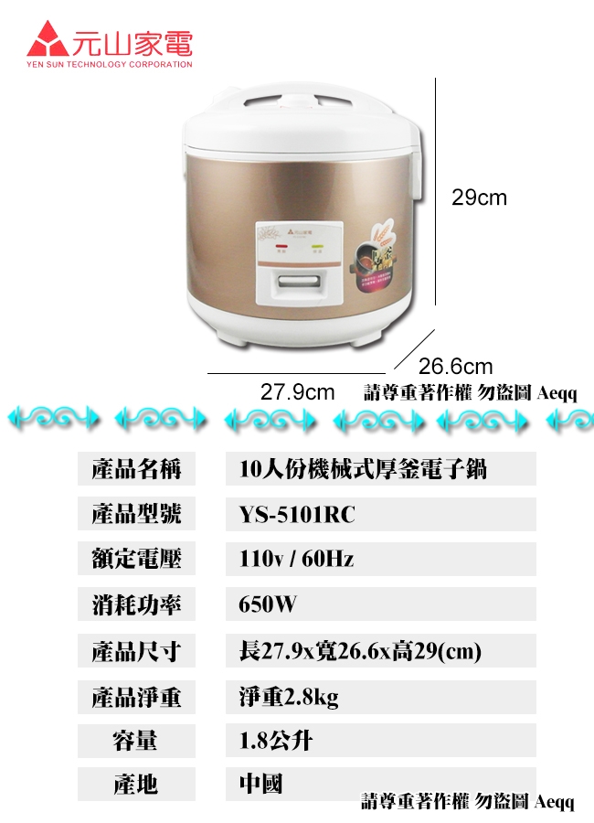 【元山牌】10人份機械式厚釜電子鍋(YS-5101RC)