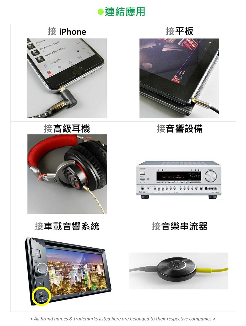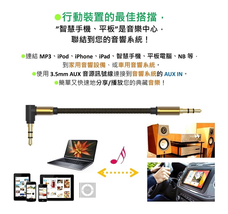 *連結MP3、iPod、iPhone、iPad、智慧手機、平板電腦等,到家用音響設備、或車用音響系統。