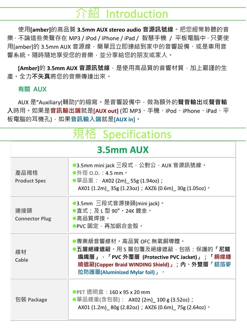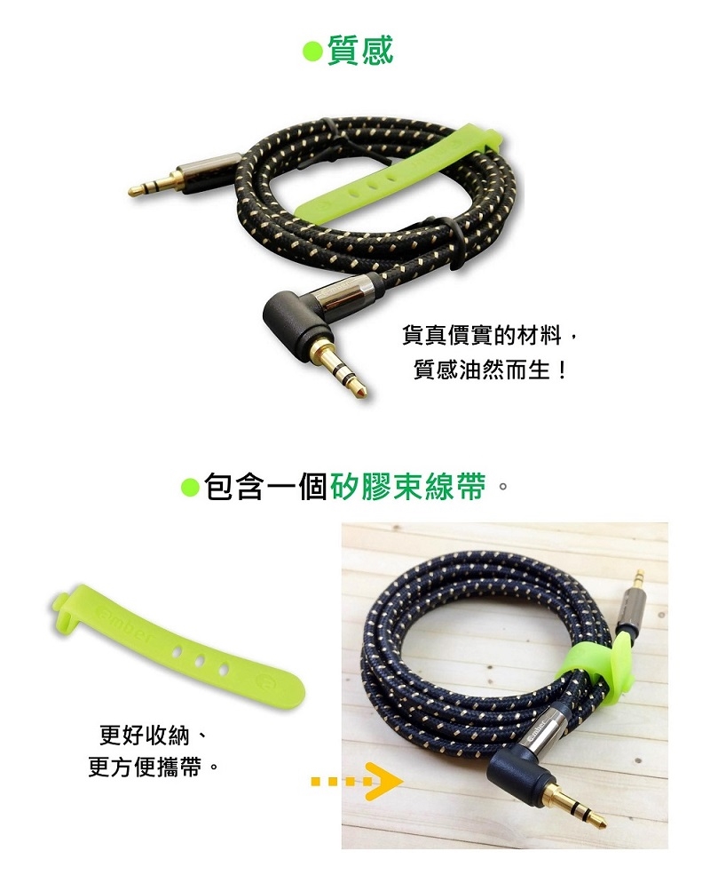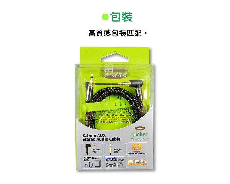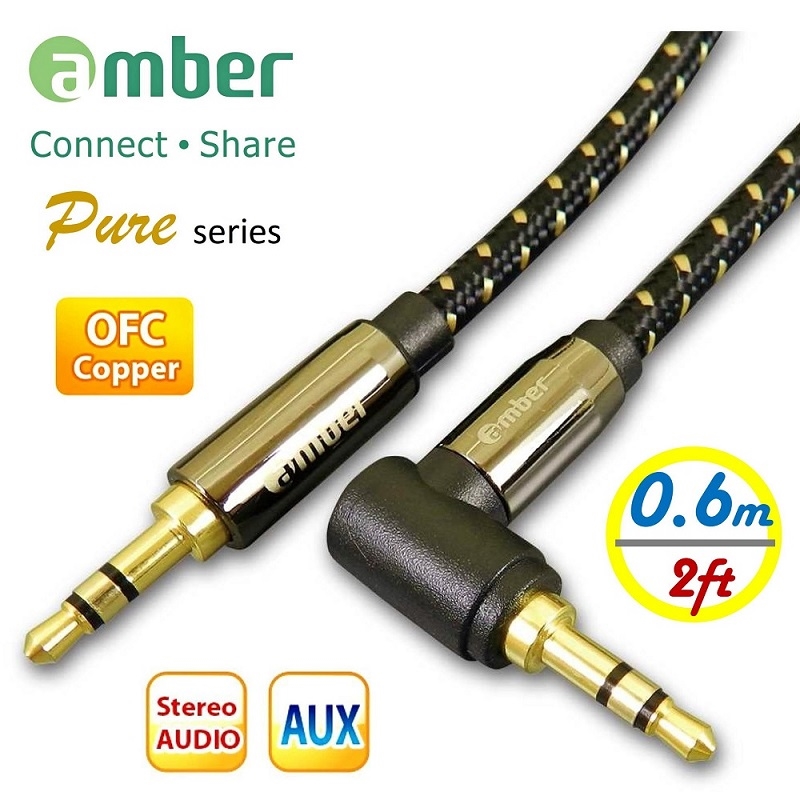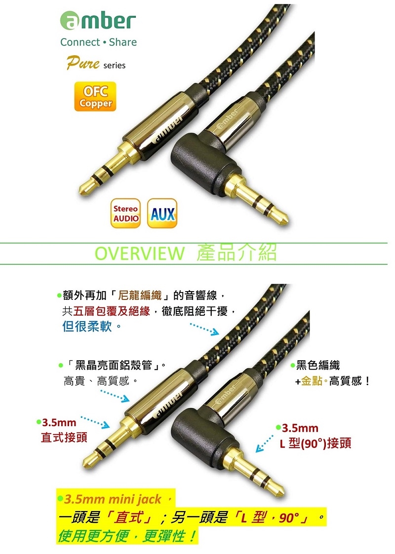 【京徹】amber 3.5mm AUX Stereo Audio立體聲音源訊號線,24K鍍金無氧銅OFC mini jack 直式&L造型-【0.6m】
