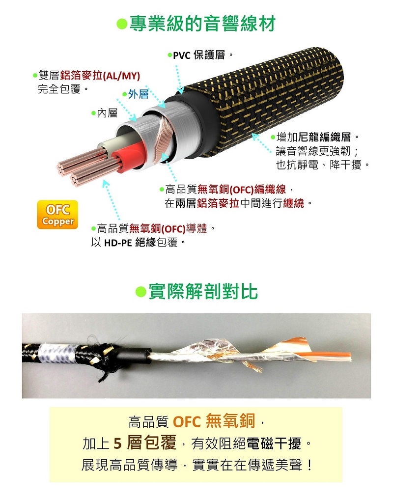 *使用「專業級高品質無氧銅OFC音響線材」,展現高品質傳導。加上絕佳「五層絕緣遮蔽保護」,確保有效阻絕電磁干擾。傳遞美聲。