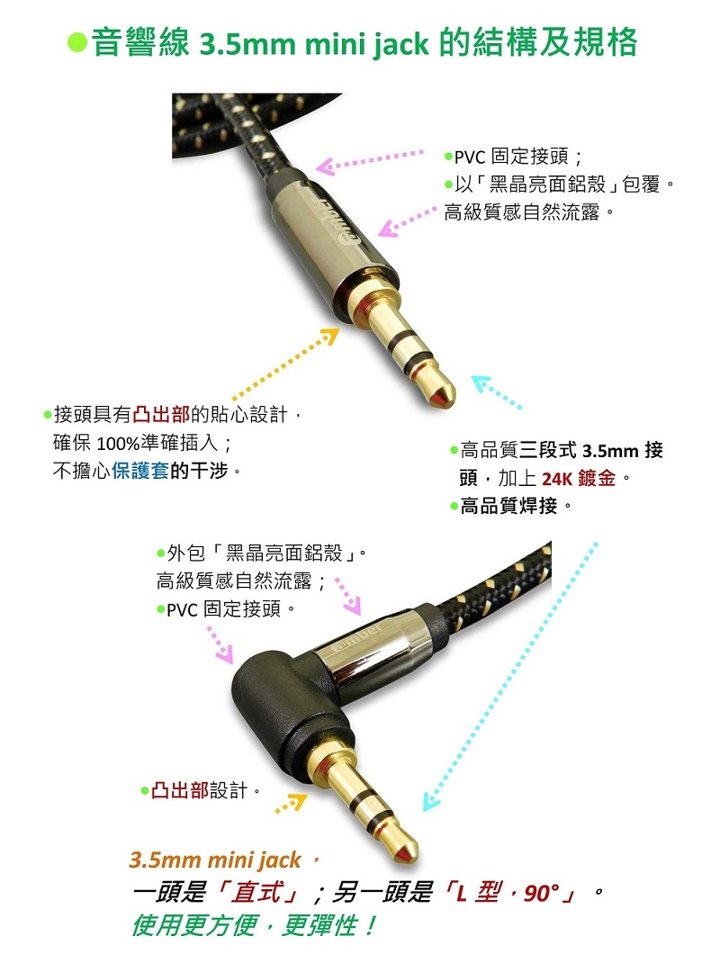 *音訊接頭(mini jack)一端採用「直式(180°)」,另一端採用「L型(90°)」。使用更方便、更彈性。