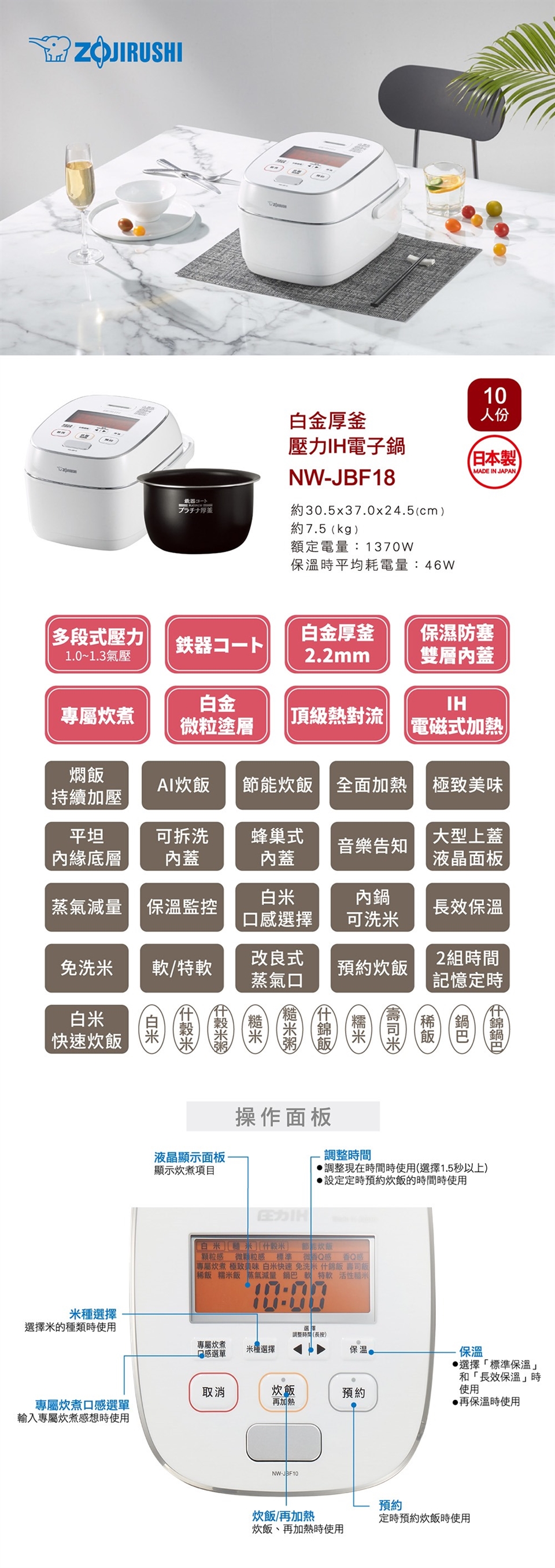 象印10人份鐵器塗層白金厚釜壓力IH電子鍋(NW-JBF18)