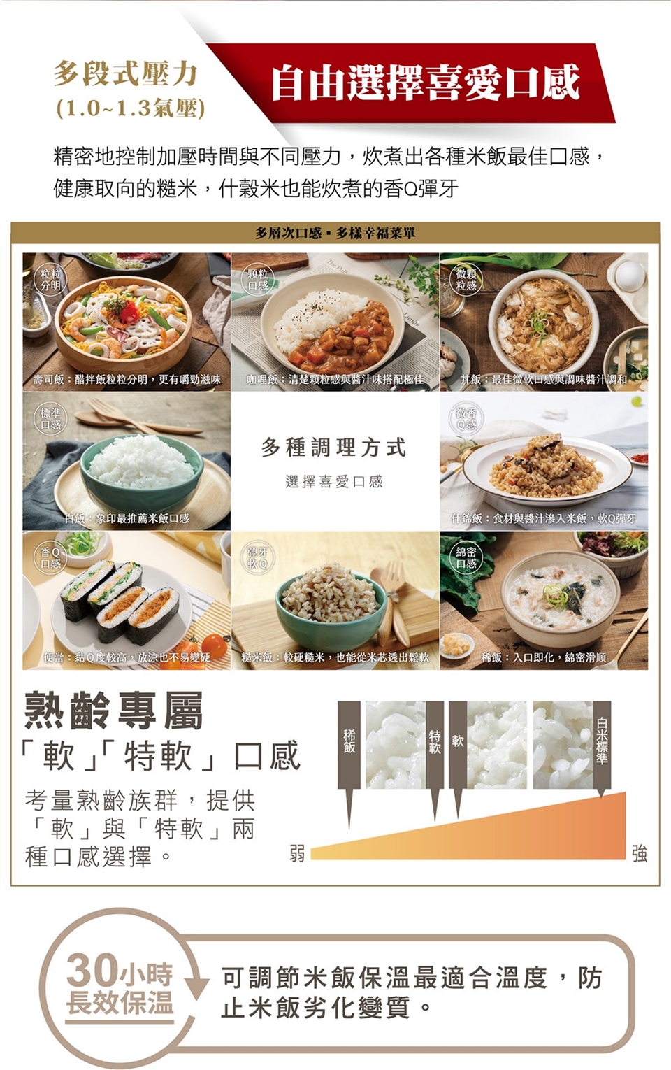 (5)「多段式壓力(1.0-1.3氣壓)」炊煮出不同口感。