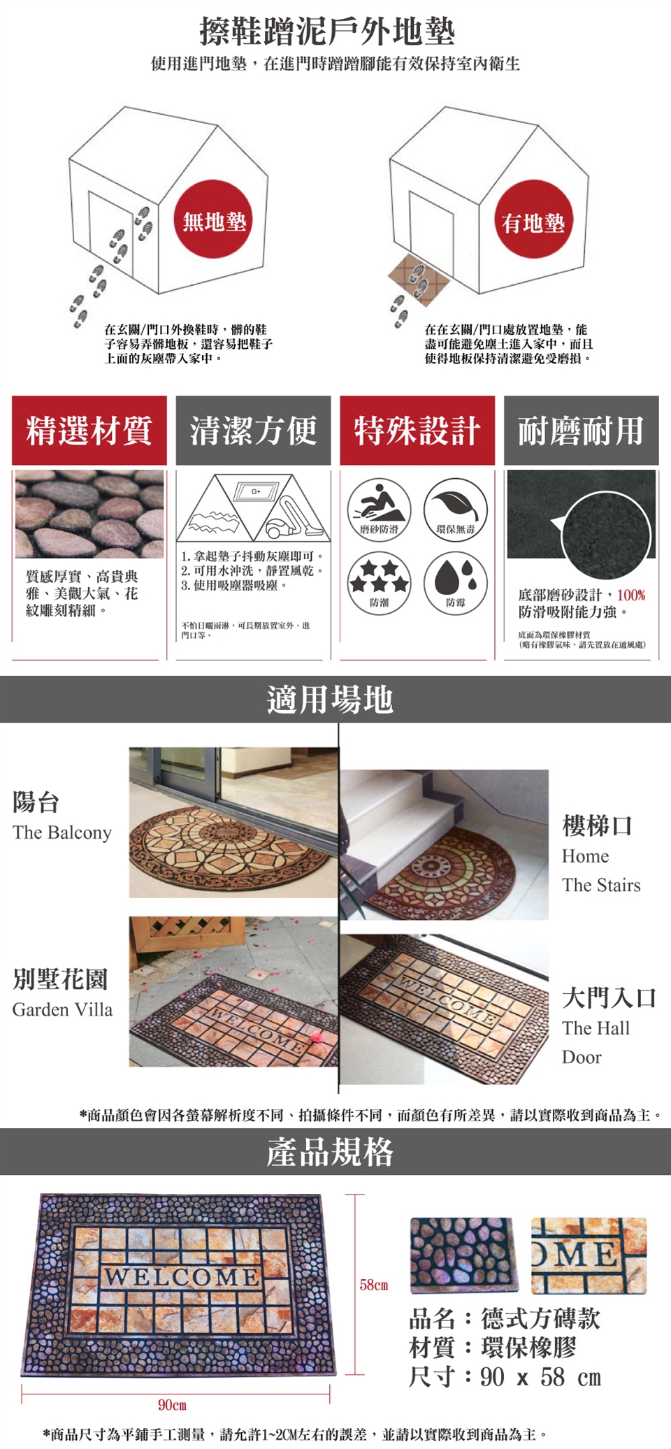 ※地墊由環保橡膠製成,故會有些許橡膠味,屬正常現象,對人體無害;將地墊放置在通風處,味道會散去