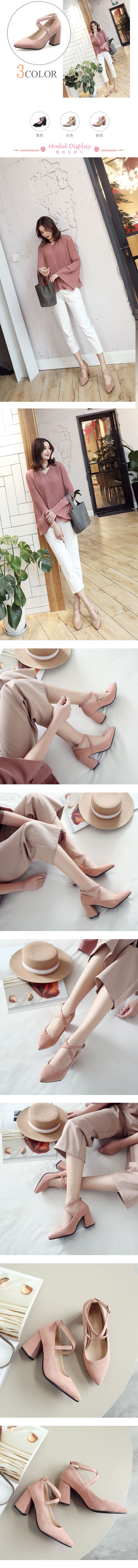 【Kissxxx】尖頭淺口交叉繞踝繫帶粗跟鞋 粉