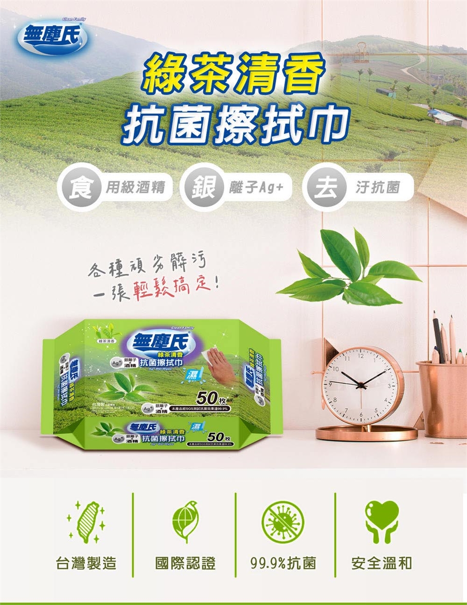 直接擦拭於物體上,或用於一般清潔及抗菌,避免環境細菌及霉菌滋生
