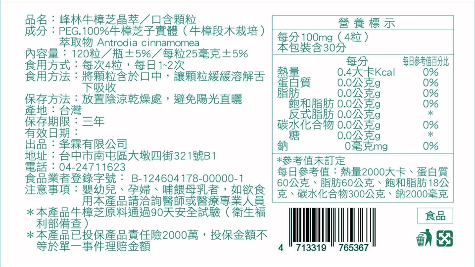 成分:PEG. 100%牛樟芝子實體 ( 牛樟段木栽培 )