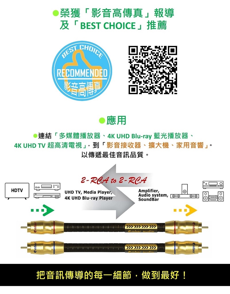 *連結「多媒體播放器、4K UHD Blu-ray藍光播放器、4K UHD TV超高清電視」,到「影音接收器、擴大機、家用音響」。以傳遞最佳音訊品質。