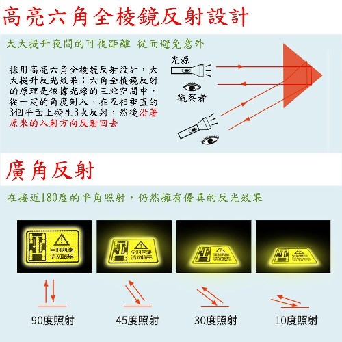 ■採用高亮六角全棱鏡反射設計,大大提升反光效果;六角全棱鏡反射的原理是依據光線的