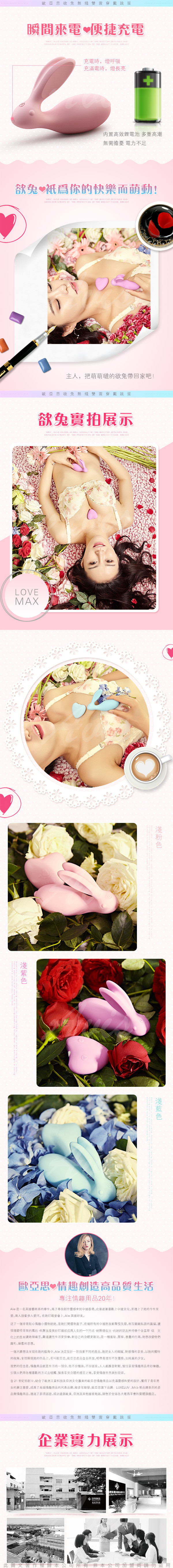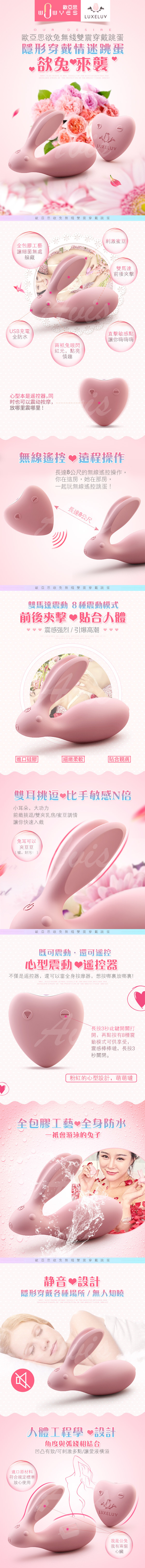 全包膠工藝,讓細菌無處躲藏 心型本是遙控器,同時也可以震動按摩,放哪裡震動哪裡 小兔兔眼閃紅光,點亮情趣 長達8M的無線遙控操作,一起玩 小耳朵,大功力,前戲挑逗,雙夾乳房,蜜豆調情,讓你快速入戲 隱形穿戴,兔身刺激蜜穴,兔耳刺激後庭
