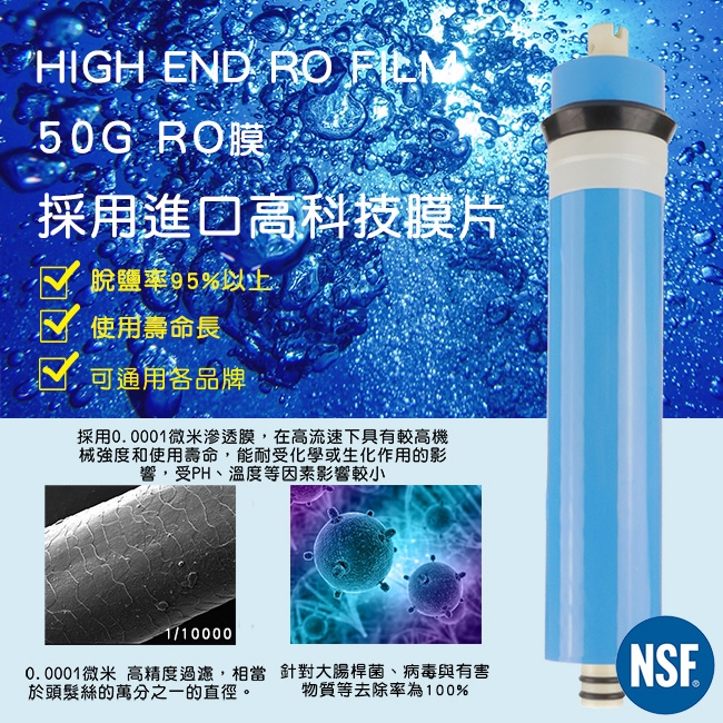 採用0.0001微米滲透膜高精度過濾,在高流速下具有較高機械強度和使用壽命,去除大腸桿菌、病毒與有害物質。