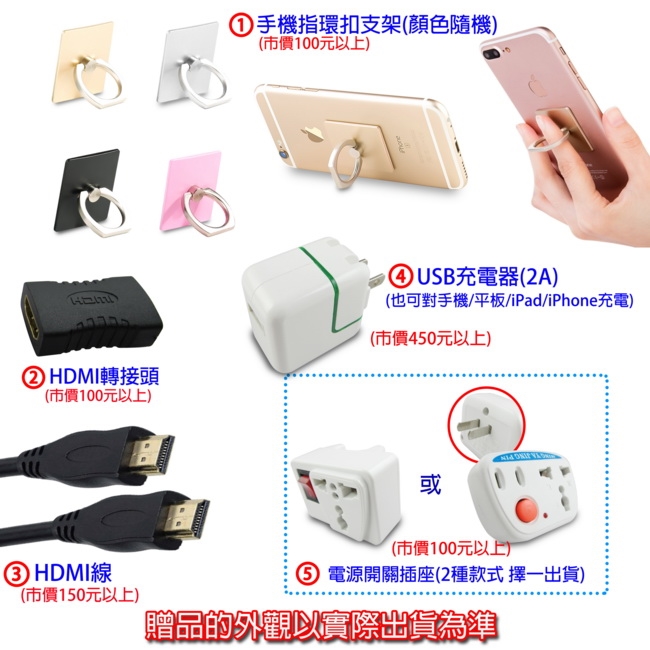 5大好禮: HDMI線x1 +HDMI轉接頭 + USB充電器(2A) x1 + 電源開關插座 + 指環扣支架x1