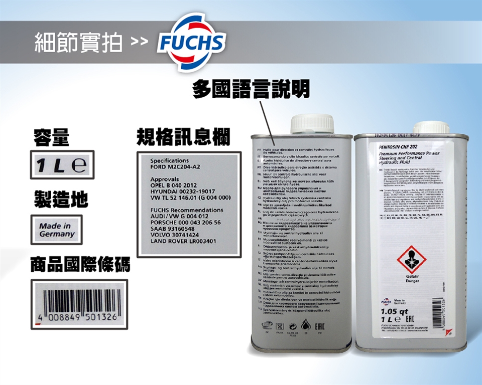 Fuchs PENTOSIN CHF 202是一種合成高性能液壓油,適用於現代車輛骨架零件的液壓系統。 Fuchs PENTOSIN CHF 202專為汽車行業的液壓設計而設計,滿足最高技術規格需求,例如:動力轉向,液位控制,避震器,液壓氣動懸架,穩定性和牽引力控制,敞篷車頂部液壓系統,中央鎖系統等 它適用於所有極端條件,並保證在-40°C至130°C以上的系統溫度下具有操作性能。