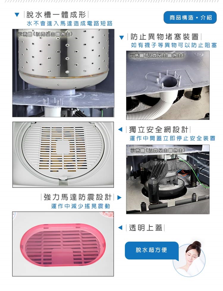 ※本脫水機僅供家庭脫衣物使用(ex:毛巾、檳榔、高麗菜..等),若作為其他用途者,則不予保固,並請自行負擔維修所產生之費用※