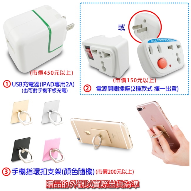 三大好禮: USB充電器(iPad專用 2A) x1 + 電源開關插座x1 +手機指環扣x1