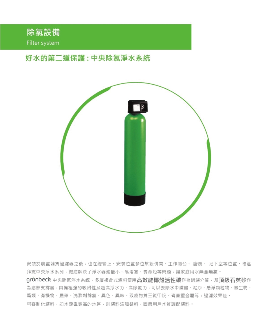 格溫拜克中央除氯淨水系統可針對泥沙、懸浮顆粒物、藻類、有機物、農藥、清潔劑、餘氯、異色、異味、三鹵甲烷、重金屬、環境賀爾蒙等做到過濾及淨化。