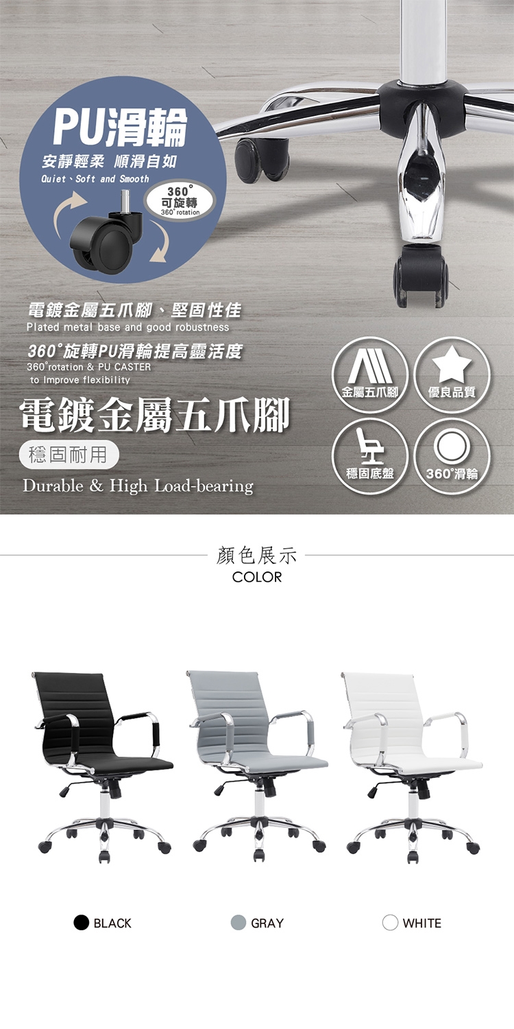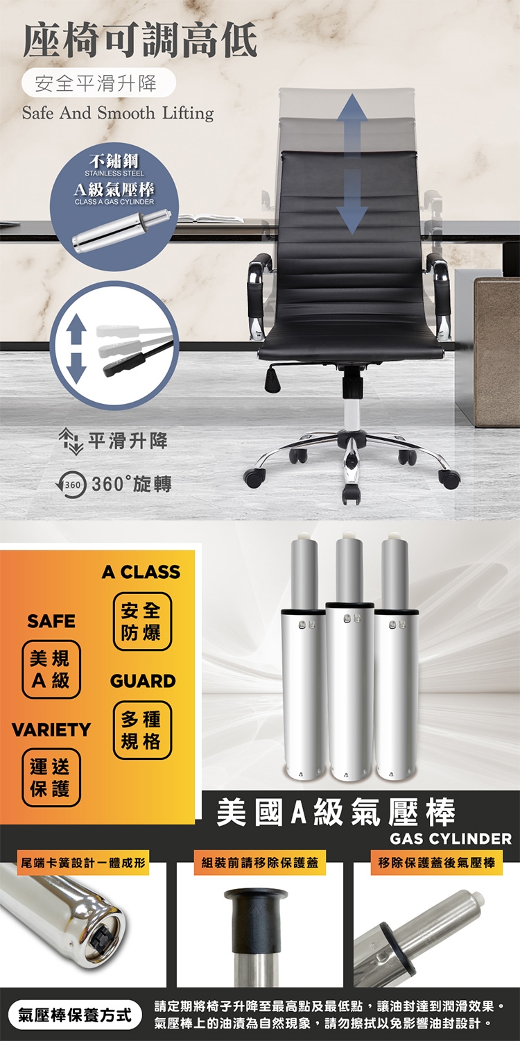配備美規A級氣壓棒、安全升降,採用電鍍金屬五爪腳,穩固耐用,360°旋轉之PU滑輪、靈活且靜音。
