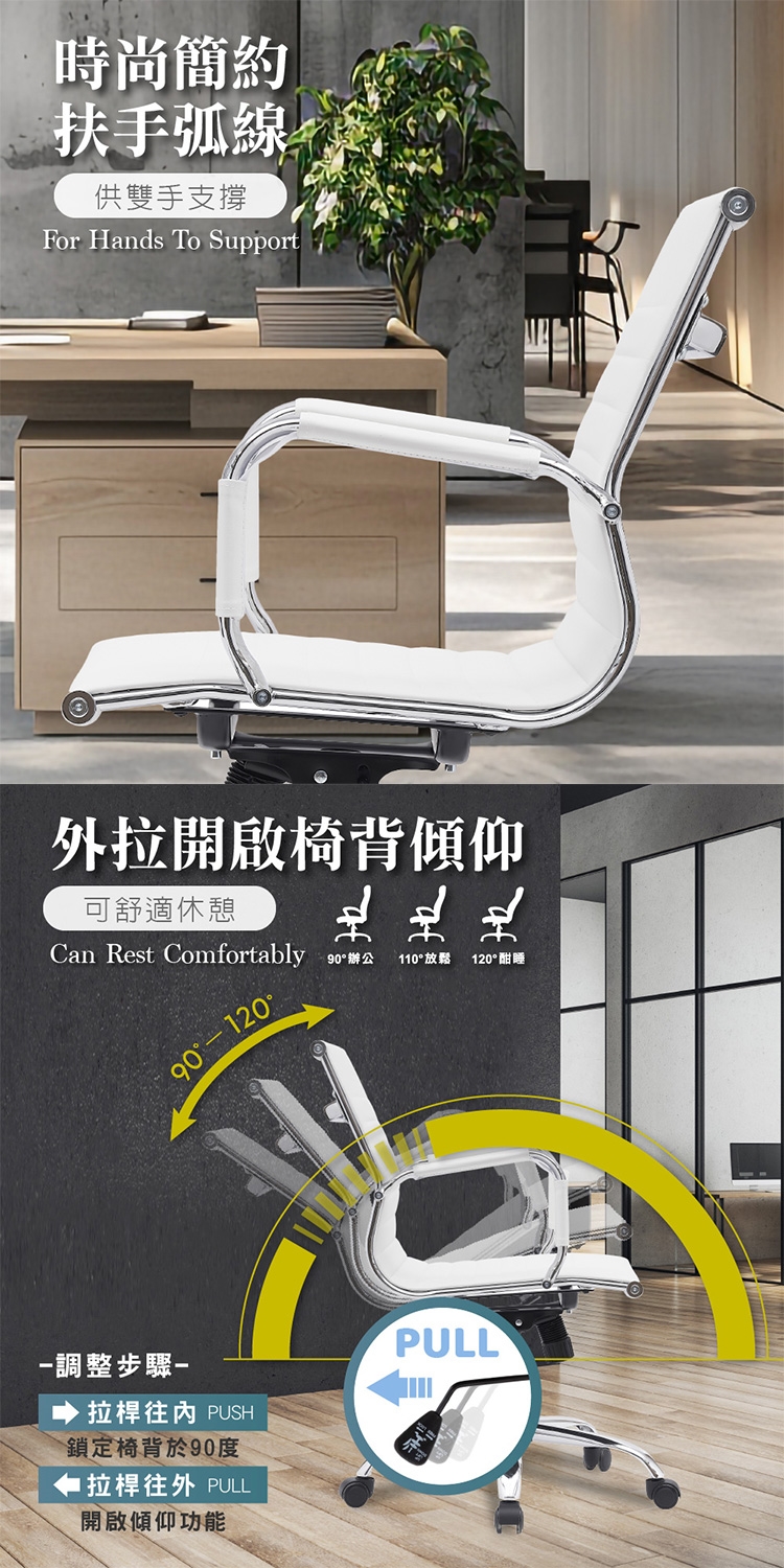電鍍金屬曲線椅框,背部好倚靠,時尚簡約的扶手弧線供雙手支撐,外拉開啟椅背傾仰,可舒適休憩,