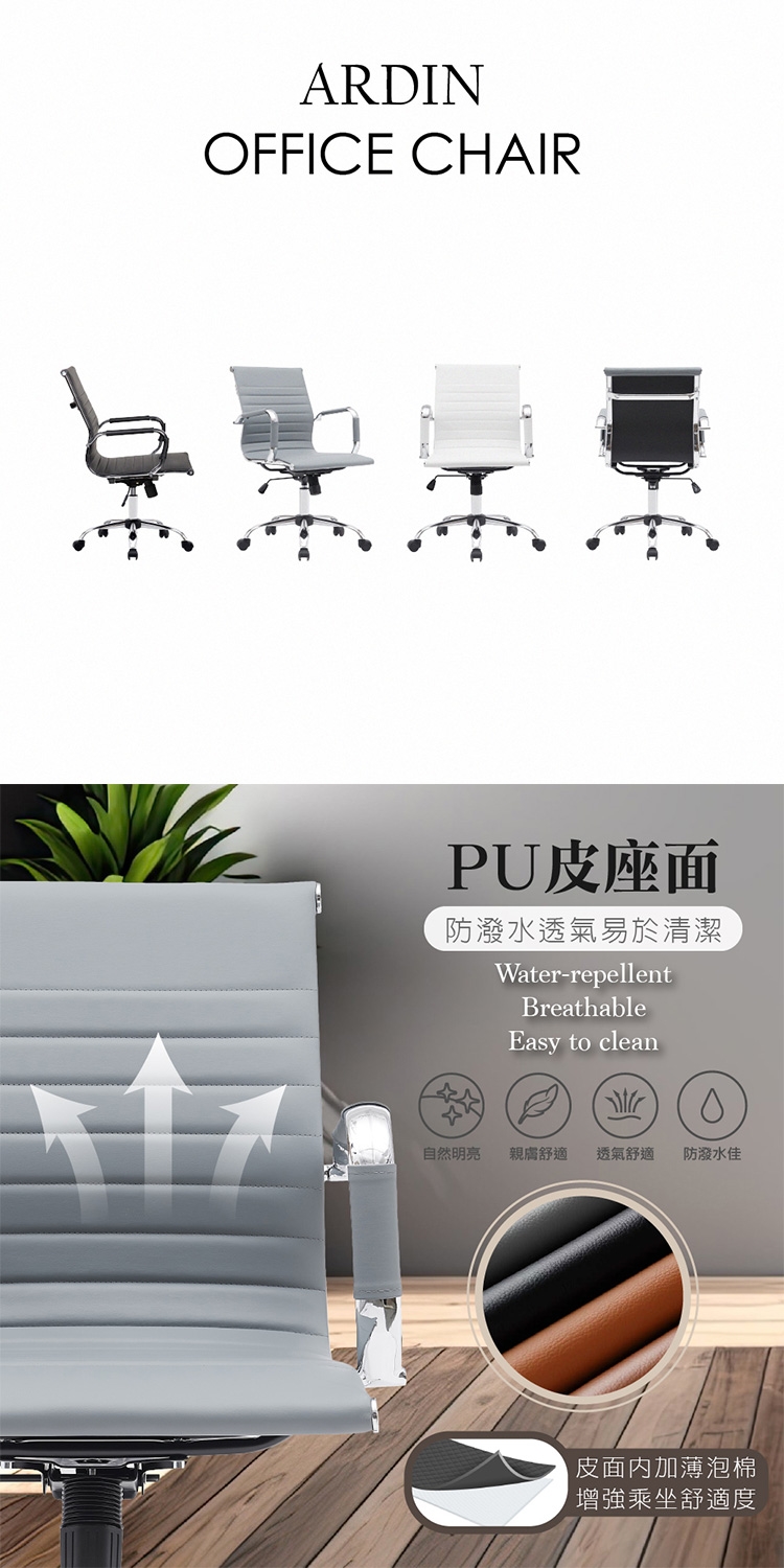 * 防潑水透氣PU皮座面,易於清潔