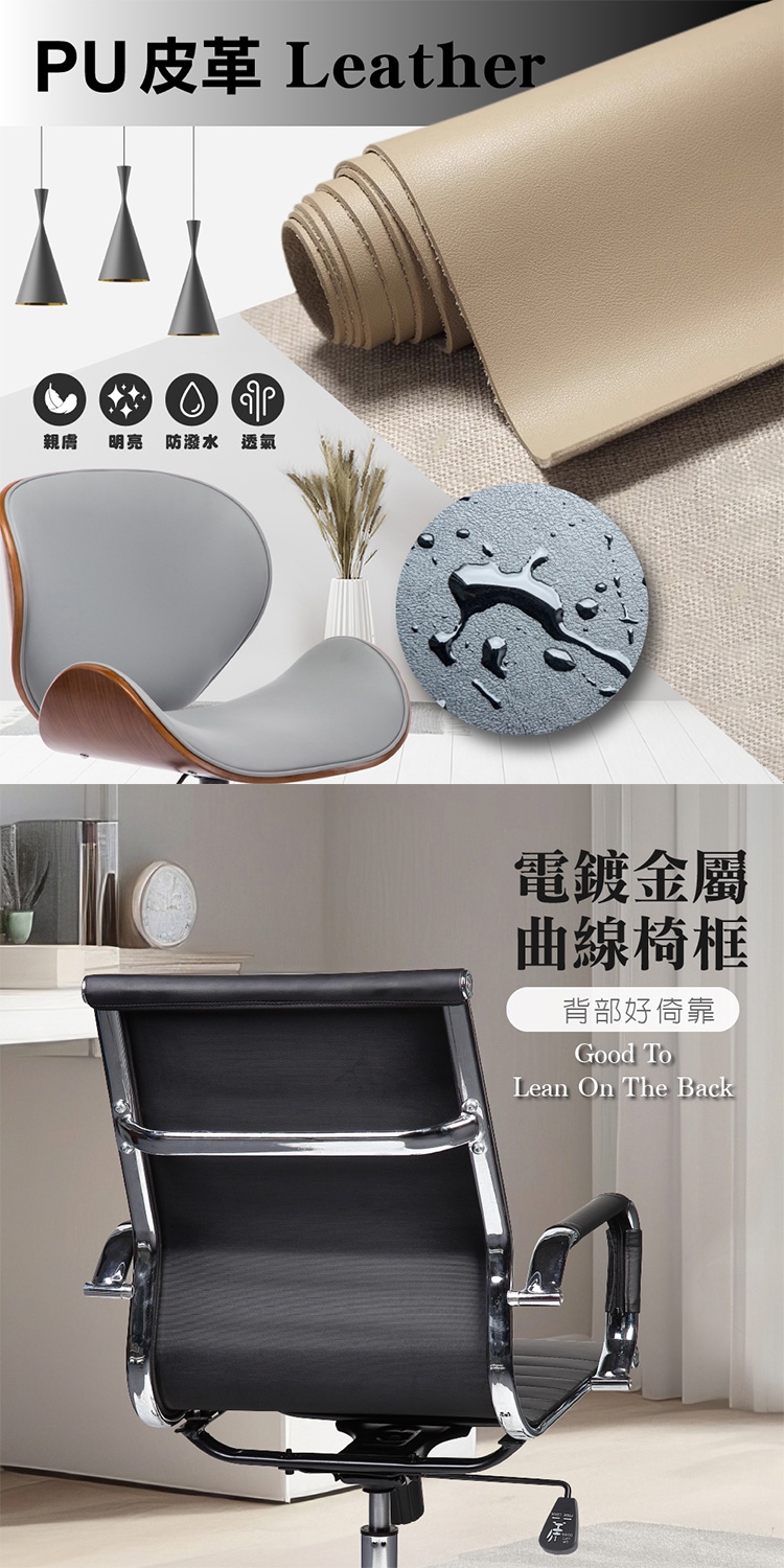 材質:PU皮 + 電鍍金屬框架 + 電鍍金屬五爪腳 + PU滑輪