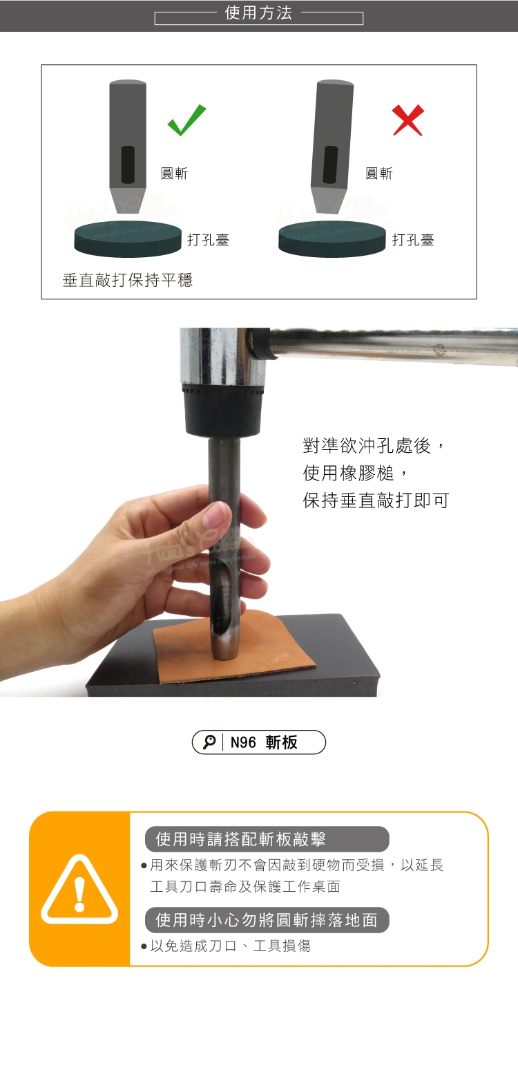 對準欲沖孔處後,使用橡膠槌保持垂直敲打即可