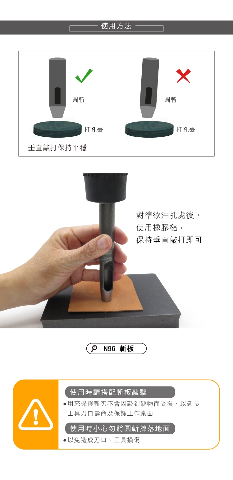 對準欲沖孔處後,使用橡膠槌保持垂直敲打即可