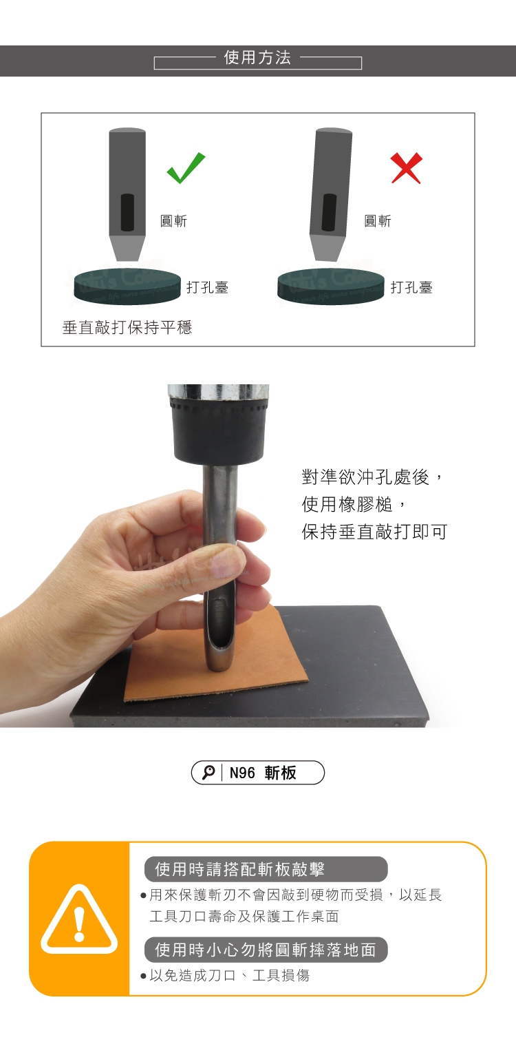 對準欲沖孔處後,使用橡膠槌保持垂直敲打即可