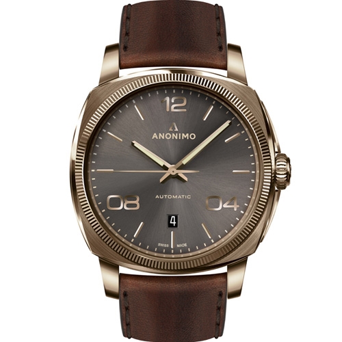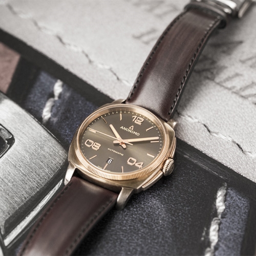 加上沉穩的無煙煤灰放射狀錶盤,搭配栗色層效果手工義大利錶帶,