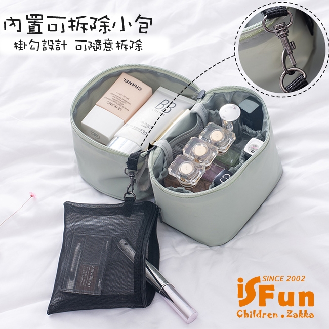 中間拉鍊開口方便使用,內裡多分隔設計,附上一個小袋可拆除使用,