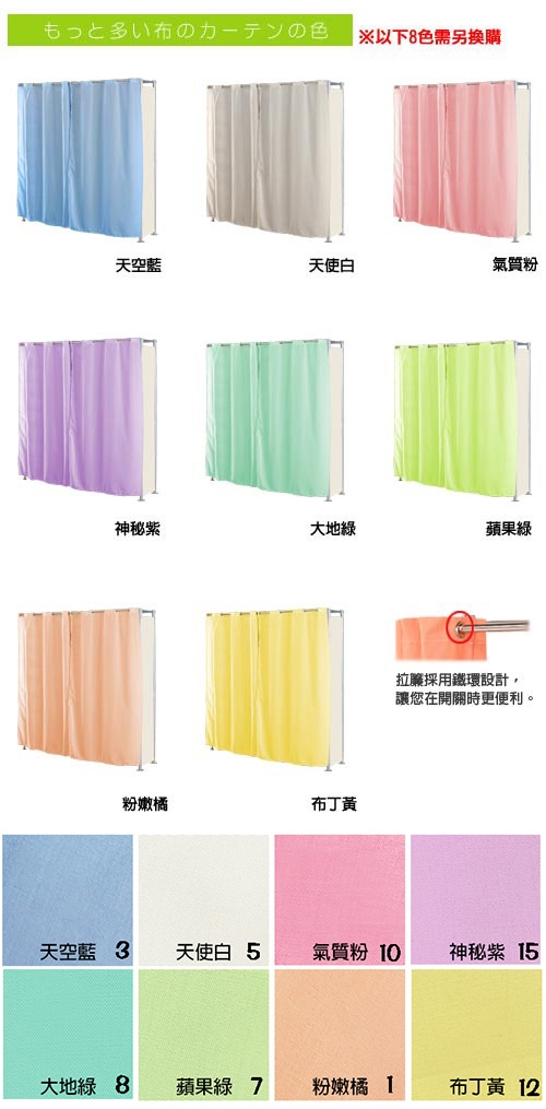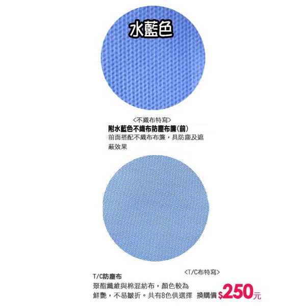 1.前面不織布防塵布可換購多色亮麗防皺T/C布,聚酯纖維與棉混紡布,色彩鮮艷美觀大方,可乾洗。