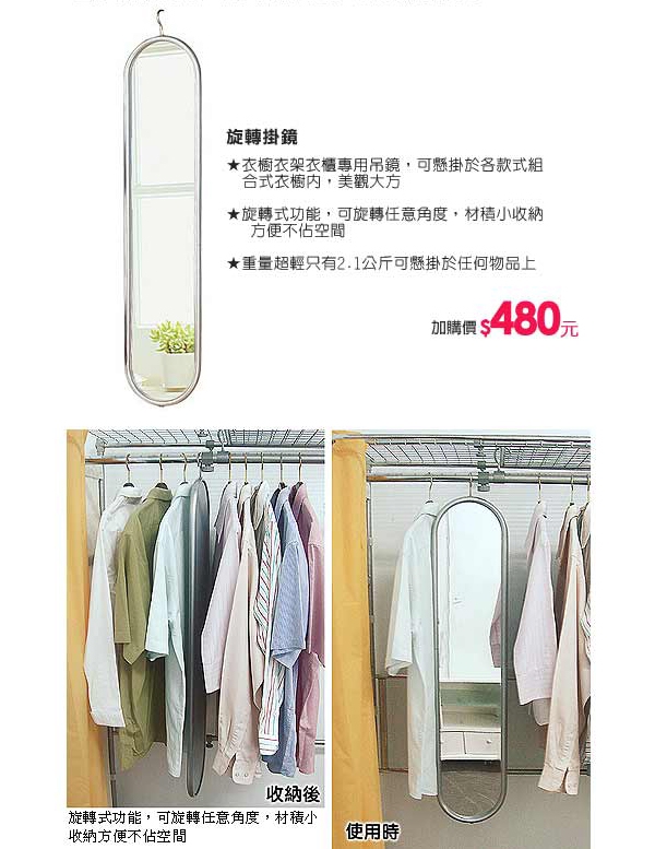 6.可加購旋轉掛鏡,輕巧好收納,整理服裝儀容相當便利。