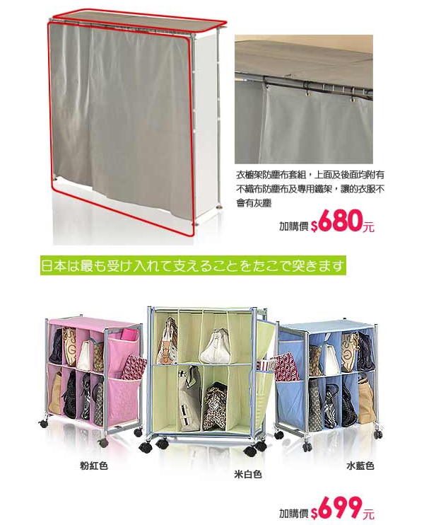2.原配備除了有前面及側邊都有布遮蔽外,可再加購防塵布套組─上面及後面的不織布防塵布及專用鐵架,讓您的衣服書本不會染灰塵,防塵力高達99%。