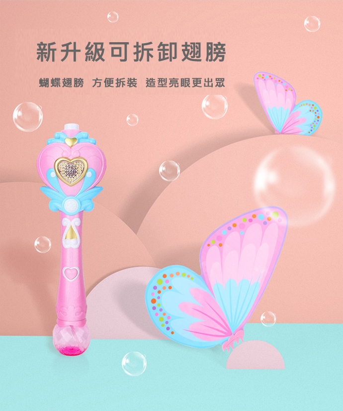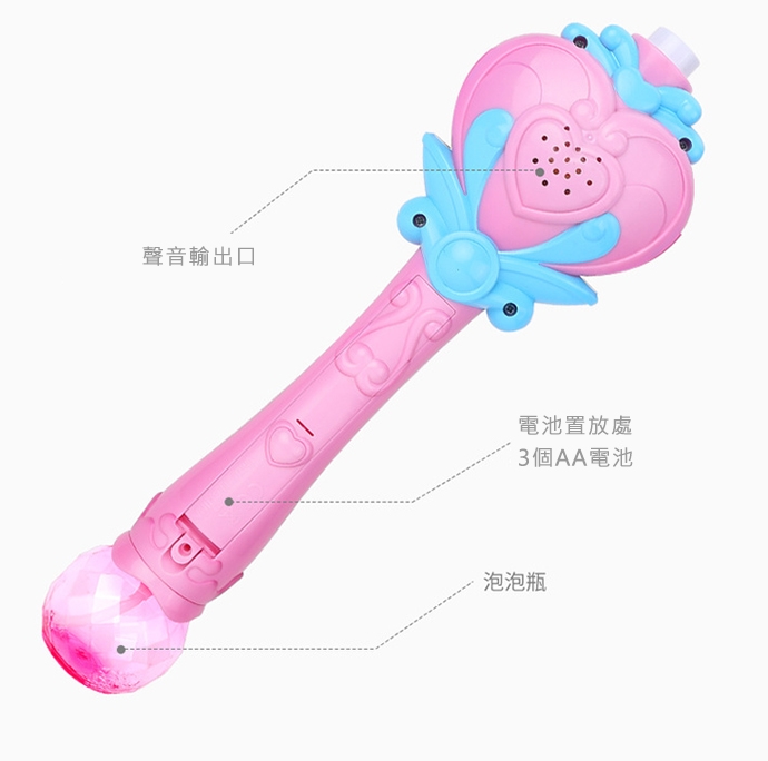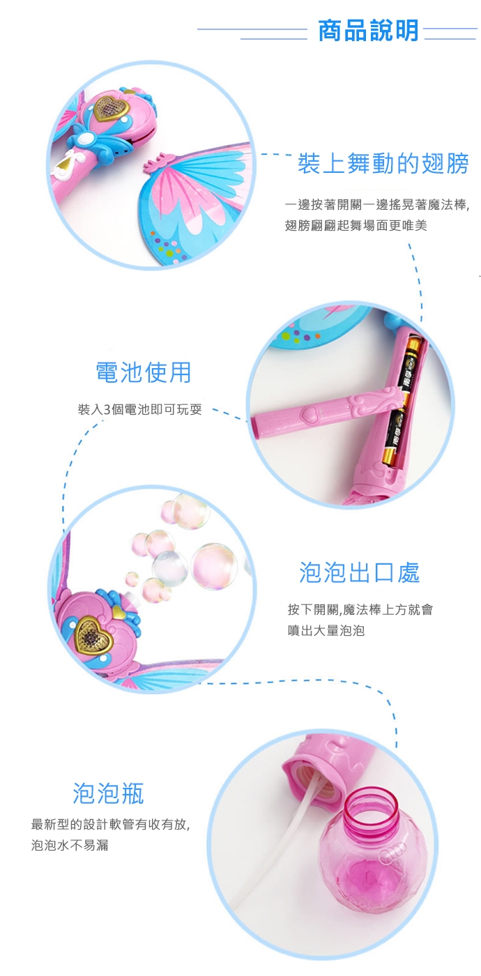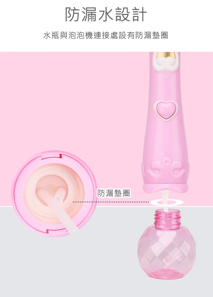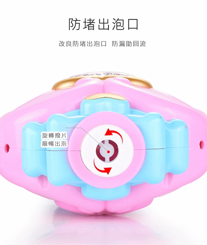 2.商品不含電池 3.更換電池時,需要先將裝泡泡液的瓶子取下來,否則瓶子 中的泡泡液可能會因為重力外洩