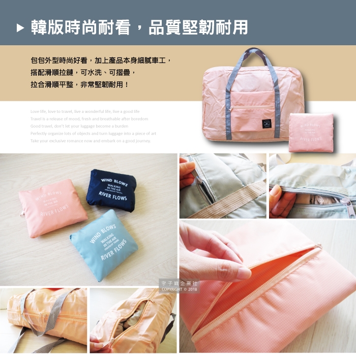 ●韓版時尚耐看,品質堅韌耐用:包包外型時尚好看,加上產品本身細膩車工,搭配滑順拉鏈,可水洗、可摺疊,拉合滑順平整,非常堅韌耐用!