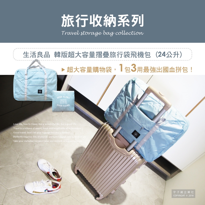 用塗:飛機包、購物袋、衣物收納包、旅行袋、手提袋等,可帶上飛機。