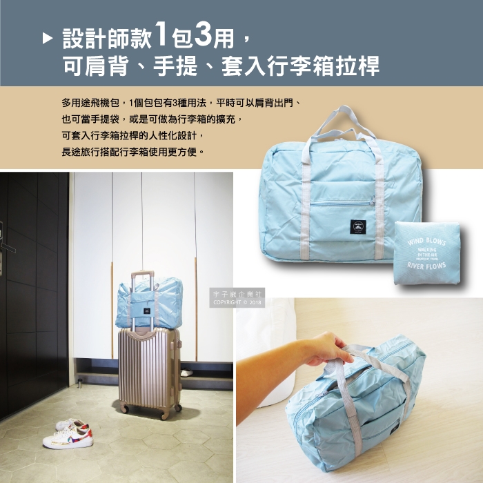 ●設計師款1包3用!可肩背、手提、套入行李箱拉桿:多用途飛機包,1個包包有3種用法,平時可以肩背出門、也可當手提袋,或是可做為行李箱的擴充,可套入行李箱拉桿的人性化設計,長途旅行搭配行李箱使用更方便。