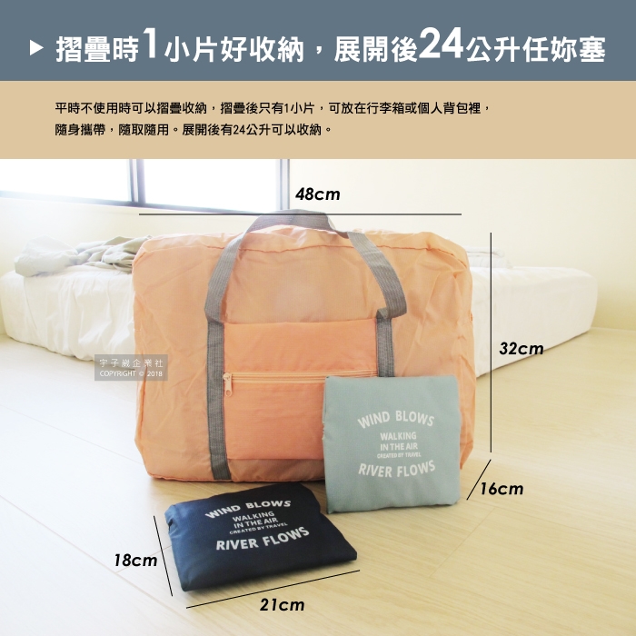 摺疊後只有1小片,可放在行李箱或個人背包裡,隨身攜帶,隨取隨用。展開後有24公升可以收納。