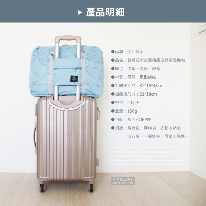 用塗:飛機包、購物袋、衣物收納包、旅行袋、手提袋等,可帶上飛機。