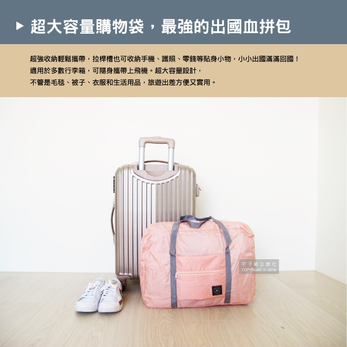 ●超大容量購物袋,最強的出國血拼包:超強收納輕鬆攜帶,拉桿槽也可收納手機、護照、零錢等貼身小物,小小出國滿滿回國!適用於多數行李箱,可隨身攜帶上飛機。超大容量設計,不管是毛毯、被子、衣服和生活用品,旅遊出差方便又實用。