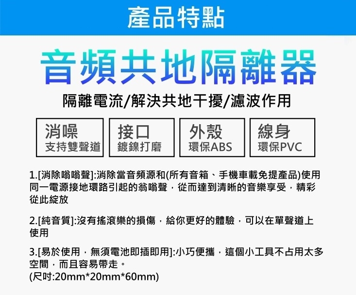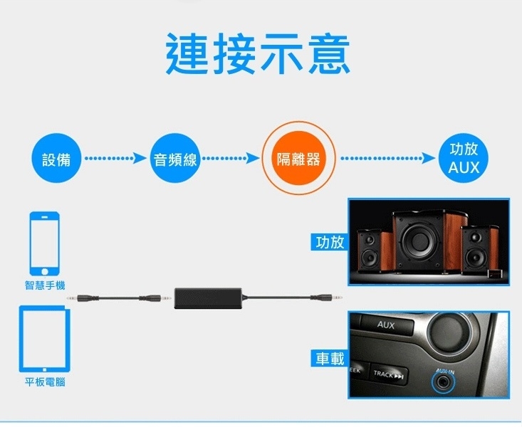 本品是音頻共地隔離器,對於音源和接收設備因為共地導致的雜音有效。