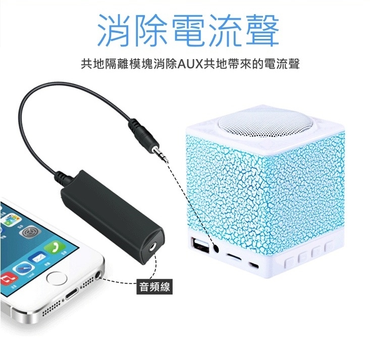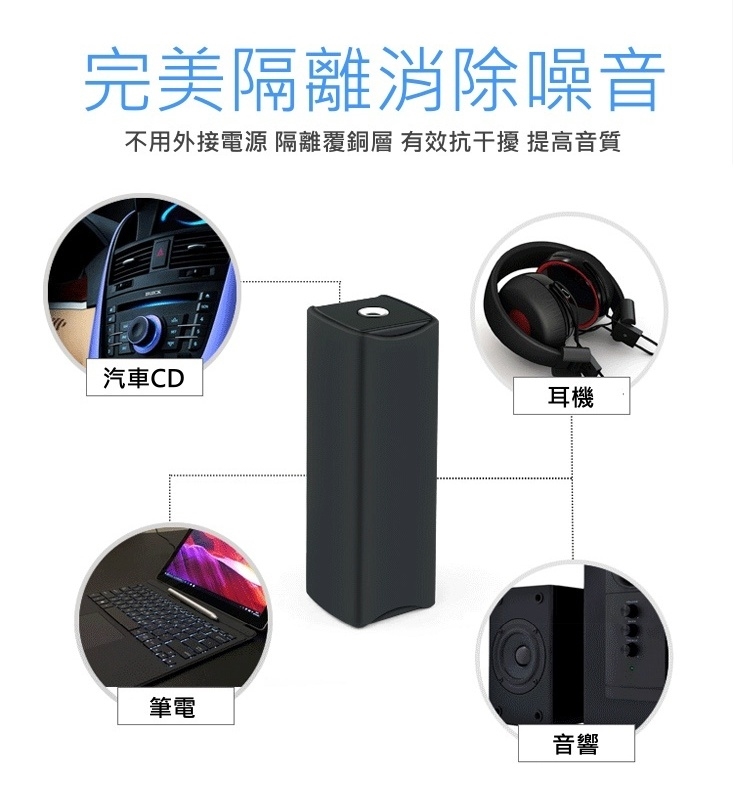 1、[消除嗡嗡聲]:消除當音頻源和(一些汽車揚聲器/家用音響系統)使用同一電源時接地環路引起的嗡嗡噪聲,從而達到清晰的音樂享受,精
