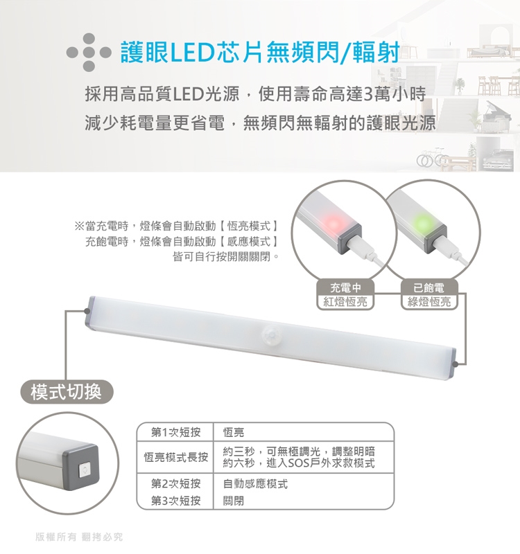 6.充飽電時,燈條會自動啟動【感應模式】,可自行按開關關閉。