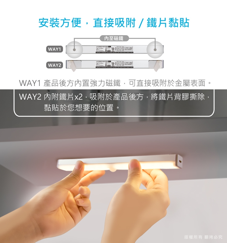 不破壞裝潢,也可將內附鐵片黏貼於欲安裝的位置,再將燈管吸附即可,