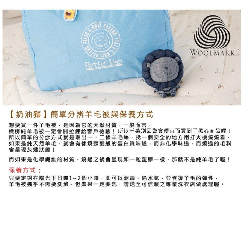【奶油獅】更精選通過國際羊毛局檢驗合格之台灣工廠,配合防螨表布做出非常適合台灣溫度與國人睡眠特性之頂級羊毛被。