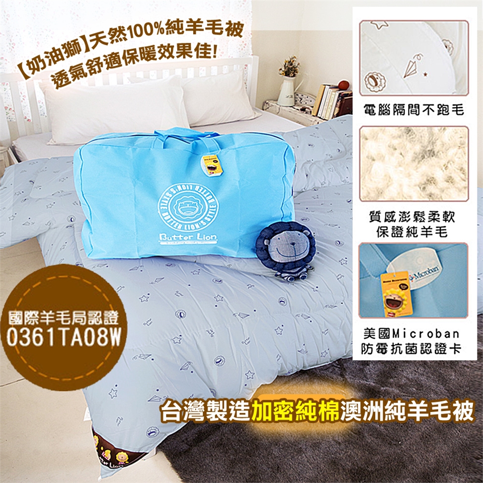 於台灣生產抗菌純棉羊毛被表布,並印上經過授權的奶油獅獨家印花,比素色款式更美觀更特別,