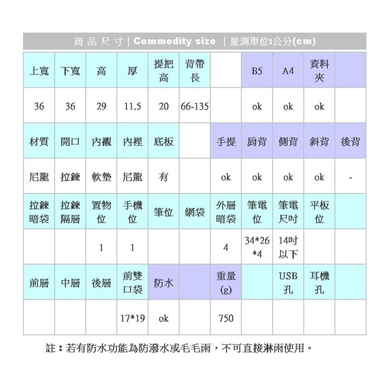 色差:商品拍攝難免會有色差問題(相機品牌、環境光源、螢幕色溫都會影響),以實際送達商品為準。 br/br/防水:賣場若標示防水!是指材質正面或內面有一般防水加工。請勿直接淋雨使用(會從縫線及拉鍊處進水)。 br/br/商品皆為實品拍攝!請安心購買!