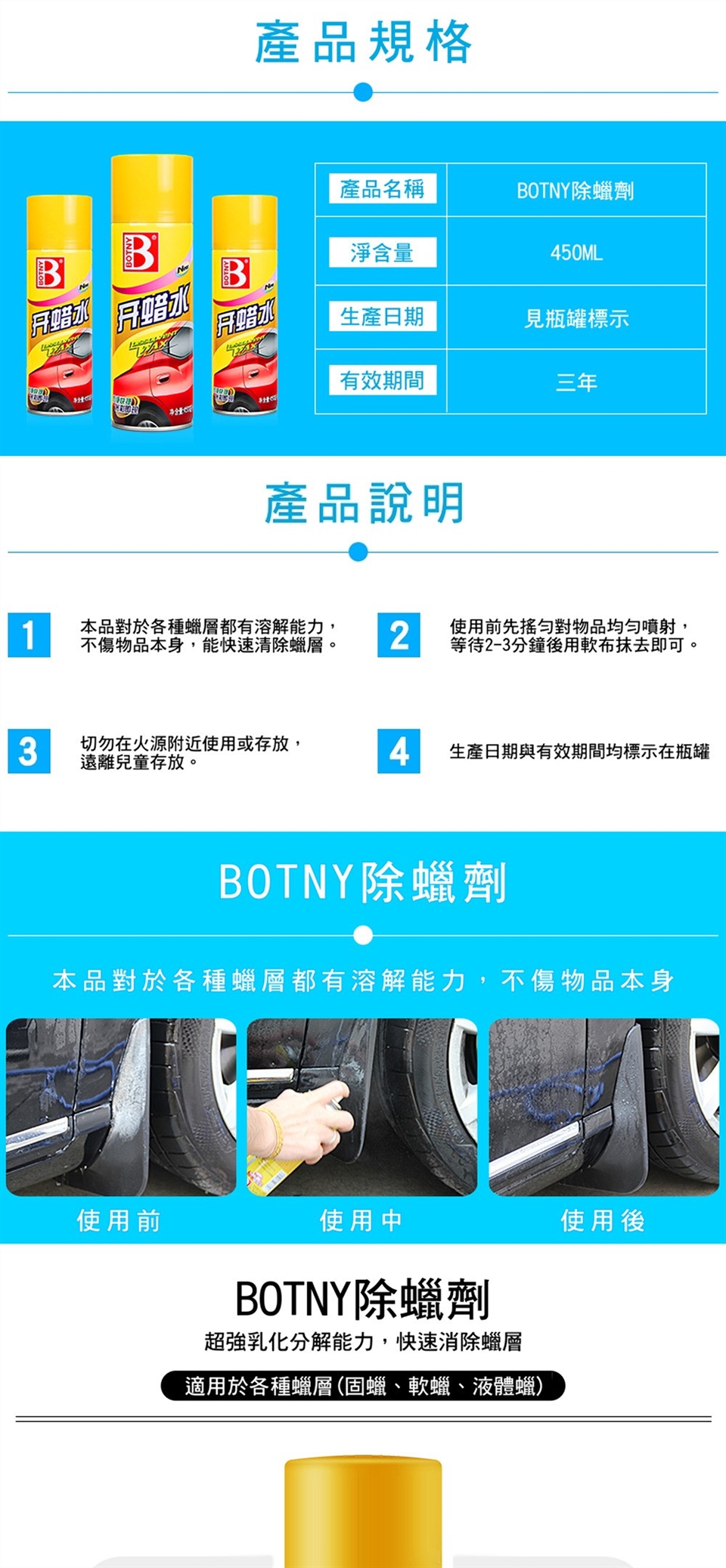 ●使用前先搖勻本劑,距離車面約15cm處均勻噴射。