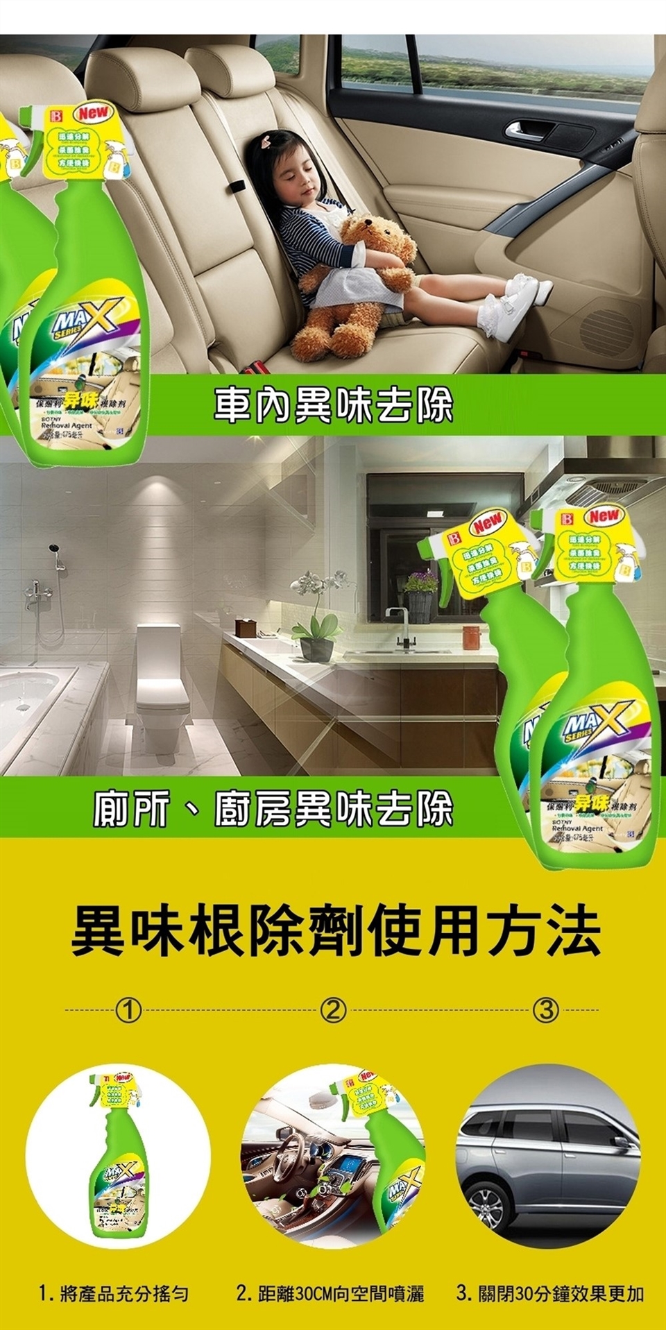 本產品改變覆蓋異味的方法,以特殊成分直接分解並從根源降解臭味。